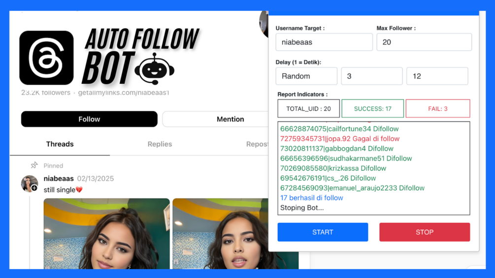 Threads Auto Follow Bot$100$100https://schema.org/InStockusdNicoNicoI want this!Size1.37 MBAdd to wishlist New wishlistShare on XShare on Facebook Copy linkCopy product URL